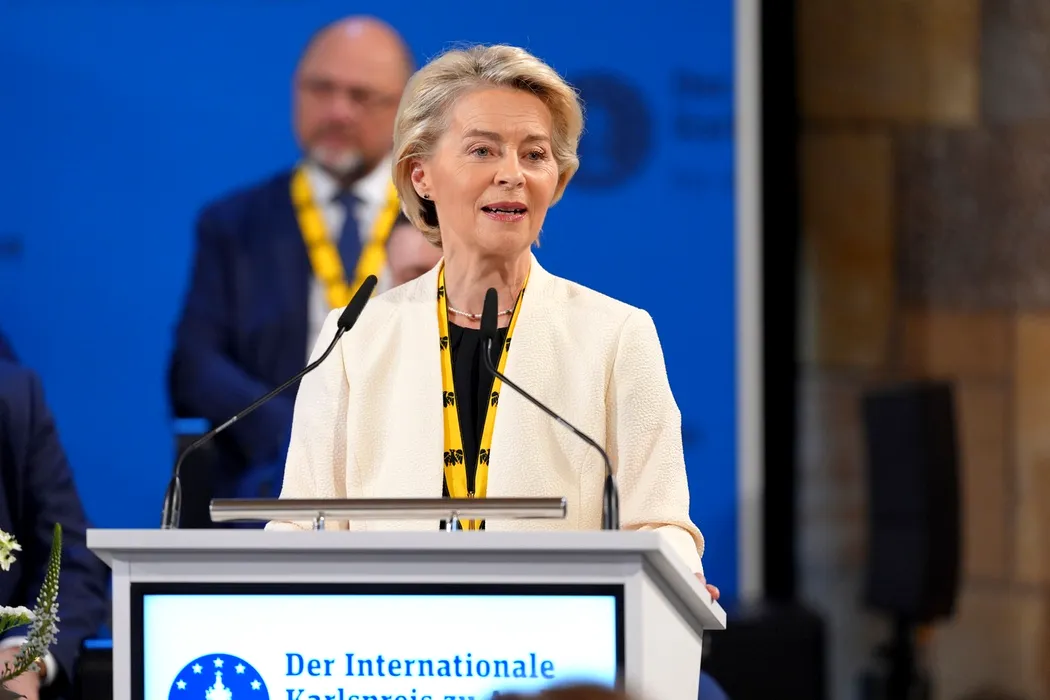 Ursula von der Leyen, în timpul discursului său de acceptare la ceremonia de decernare a Premiului Internațional Charlemagne 2025 de la Primăria din Aachen.