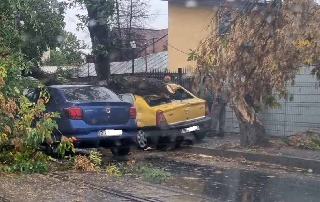 Vântul a făcut prăpăd în București: o persoană rănită, zeci de mașini distruse de copacii căzuți, cabluri rupte, construcții avariate