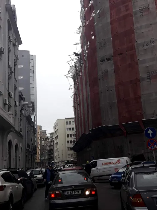 Vântul face primele ravagii în Capitală: O schelă s-a desprins parțial iar bucăți din structură au avariat mașini / ISU reacționează: Recomandarea e să se asigure schelele prin fixare temeinică. Pietonii să manifeste prudență