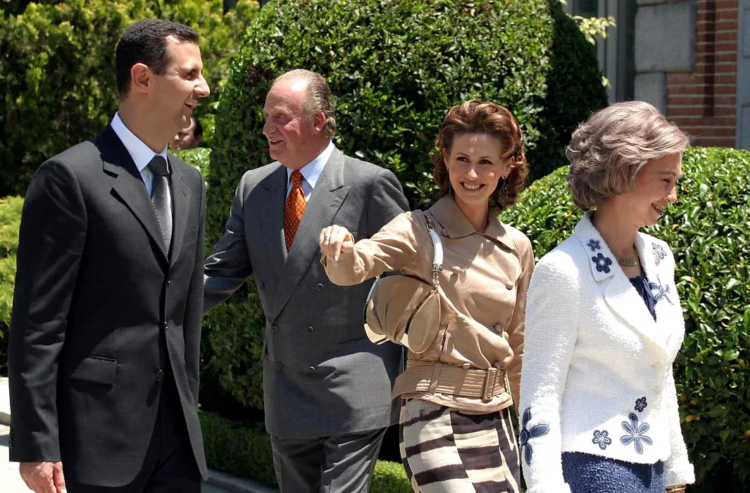 Bashar al-Assad, soția sa Asma, regele spaniol Juan Carlos și soția sa Sofia, la palatul regal din Madrid în iunie 2004.