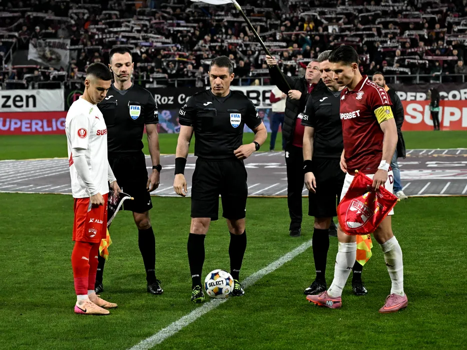 Brigada de arbitrii formată din Ferencz Tunyogi, Istvan Kovacs si Ioan Alexandru Corb alături de căpitanii Catalin Ionut Cirjan si Mihai Alexandru Dobre la meciul de fotbal dintre Rapid Bucuresti si Dinamo Bucuresti, din cadrul Play off-ului Superligii Superbet, desfasurat pe Superbet Arena-Giulesti din Bucuresti, sambata 14 martie 2026. © FOTO:Razvan Pasarica/SPORT PICTURES