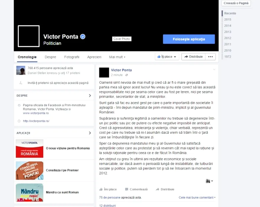 Victor Ponta, pe Facebook: ”Sper ca depunerea mandatului meu și al Guvernului să satisfacă așteptările celor care au protestat”. Ulterior, mesajul a fost șters