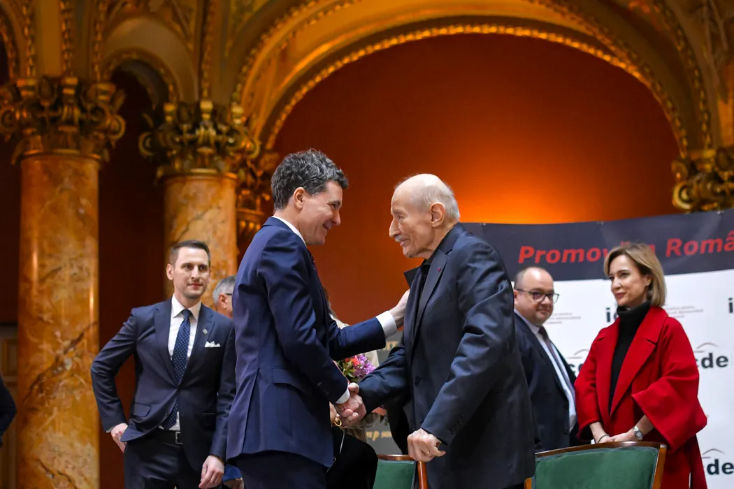 Presedintele Romaniei, Nicusor Dan si actorul Victor Rebengiuc participa la la ceremonia de decernare a Premiului Romania Europeana 2025, oferit de Asociatia Initiativa pentru Cultura Democratica Europeana, la Ateneul Roman, joi, 4 decembrie 2025. ALEXANDRU DOBRE / MEDIAFAX FOTO.