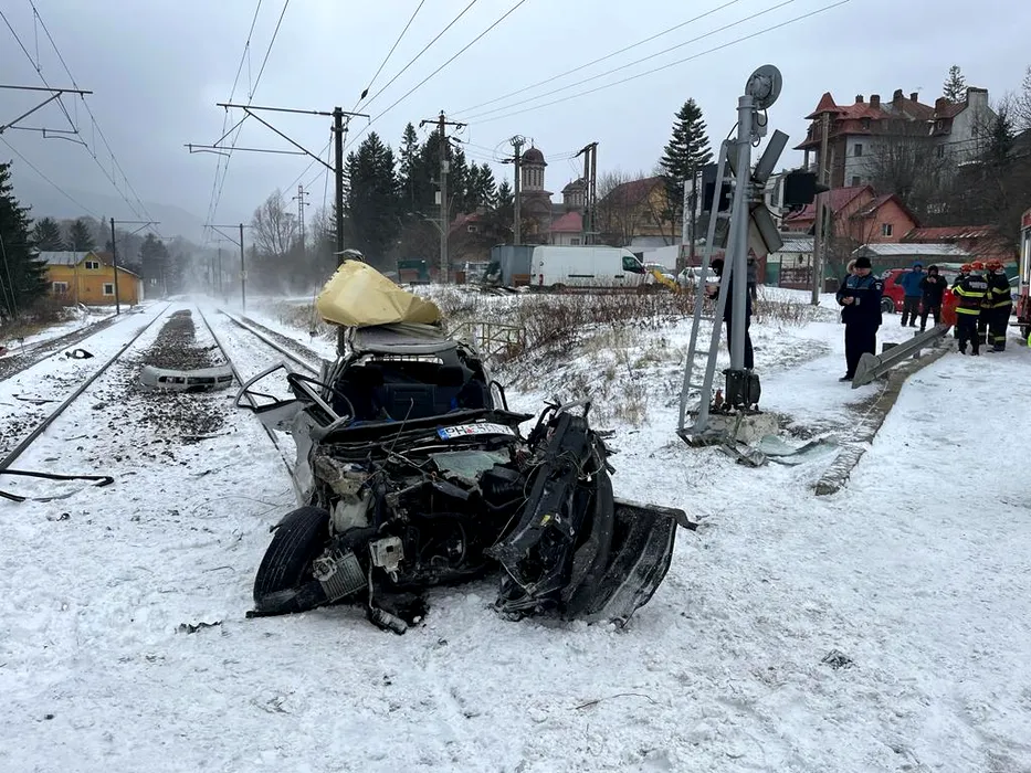 VIDEO | Accident feroviar în orașul Bușteni. Un copil, printre răniți. Un autoturism a fost izbit de tren și proiectat într-un alt tren