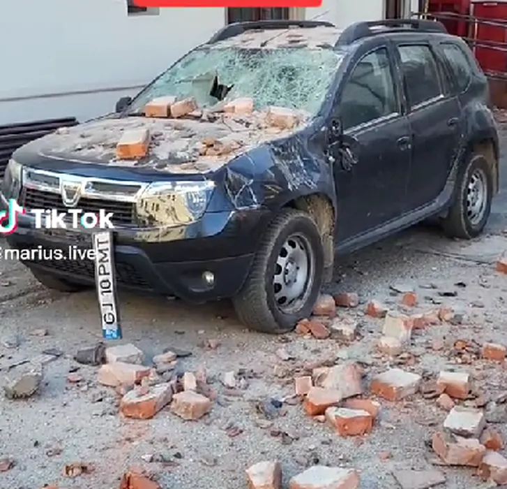 VIDEO | Bucăți de tencuială au căzut peste mașini la Târgu Jiu. Clădirea Primăriei a fost evacuată