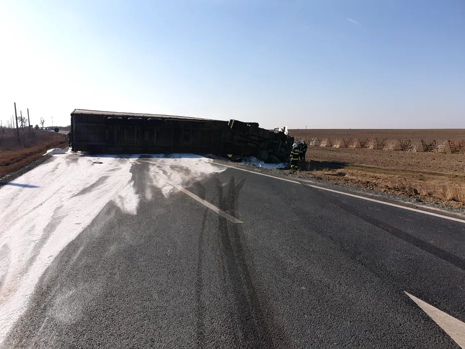 VIDEO | Cum a fost evitată o tragedie ca cea de la Mihăilești, în care 18 persoane au murit. Ce au făcut pompierii după ce un TIR cu azotat s-a răsturnat vineri în Ialomița