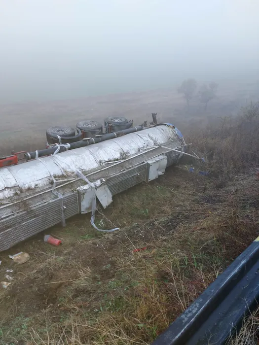 VIDEO & FOTO | Trafic blocat pe DN 6 – E 70 după ce o autocisternă, încărcată cu sodă caustică, s-a răsturnat