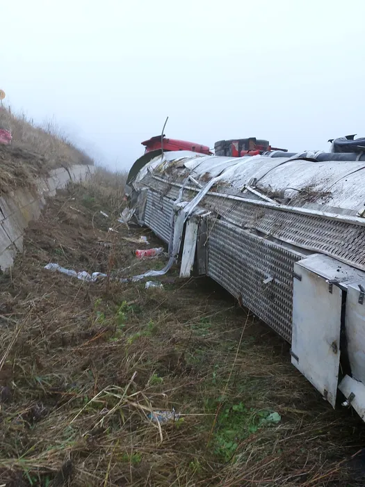 VIDEO & FOTO | Trafic blocat pe DN 6 – E 70 după ce o autocisternă, încărcată cu sodă caustică, s-a răsturnat