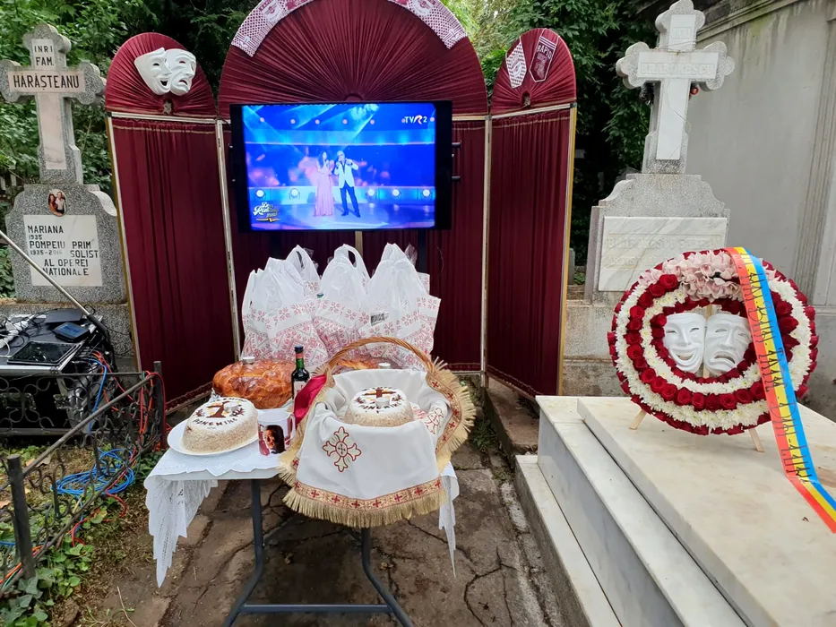 Ecranul din Cimitirul Bellu pe care rulează imagini cu actorul Ion Dichiseanu