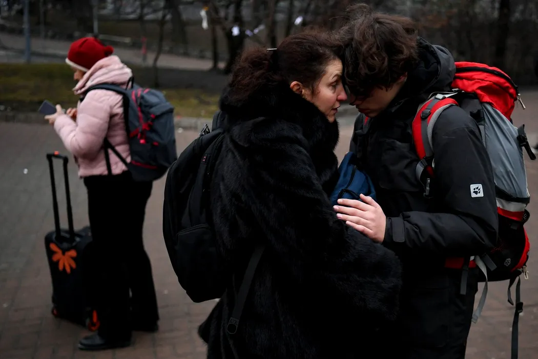 People hug as a woman with a suitcase uses her smartphone outside a metro station in Kyiv in the morning of February 24, 2022. Russian President Vladimir Putin announced a military operation in Ukraine on Thursday with explosions heard soon after across the country and its foreign minister warning a "full-scale invasion" was underway.,Image: 664566246, License: Rights-managed, Restrictions: , Model Release: no, Credit line: Profimedia