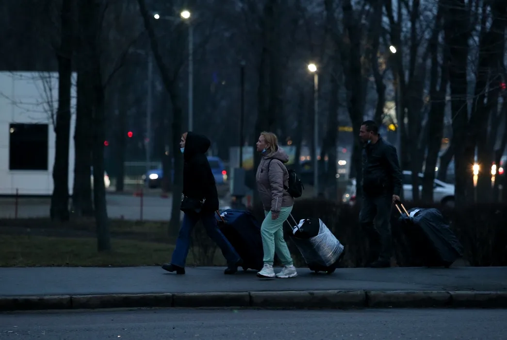 8124793 24.02.2022 People walk along a street with their luggage in Kiev, Ukraine. On February 24 Russian President Vladimir Putin announced a military operation in Ukraine following recognition of independence of breakaway Donbas republics.,Image: 664576762, License: Rights-managed, Restrictions: , Model Release: no, Credit line: Profimedia