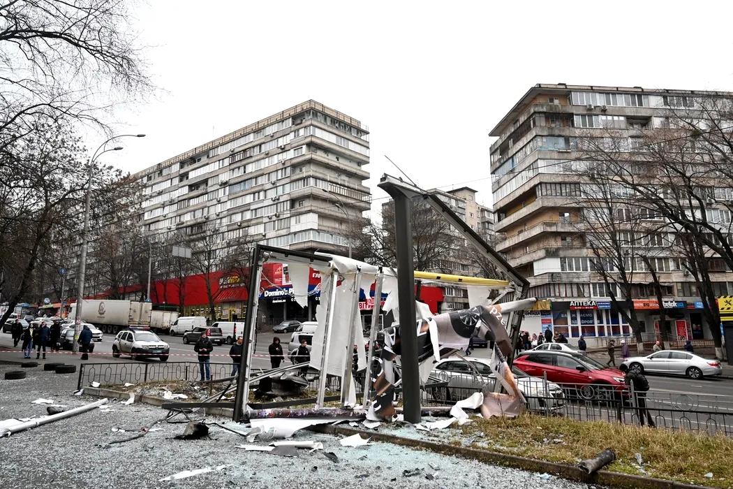 People are seen outside the cordoned off area around the remains of a shell in a street in Kyiv on February 24, 2022. Russian President Vladimir Putin announced a military operation in Ukraine on Thursday with explosions heard soon after across the country and its foreign minister warning a "full-scale invasion" was underway.,Image: 664577500, License: Rights-managed, Restrictions: , Model Release: no, Credit line: Profimedia