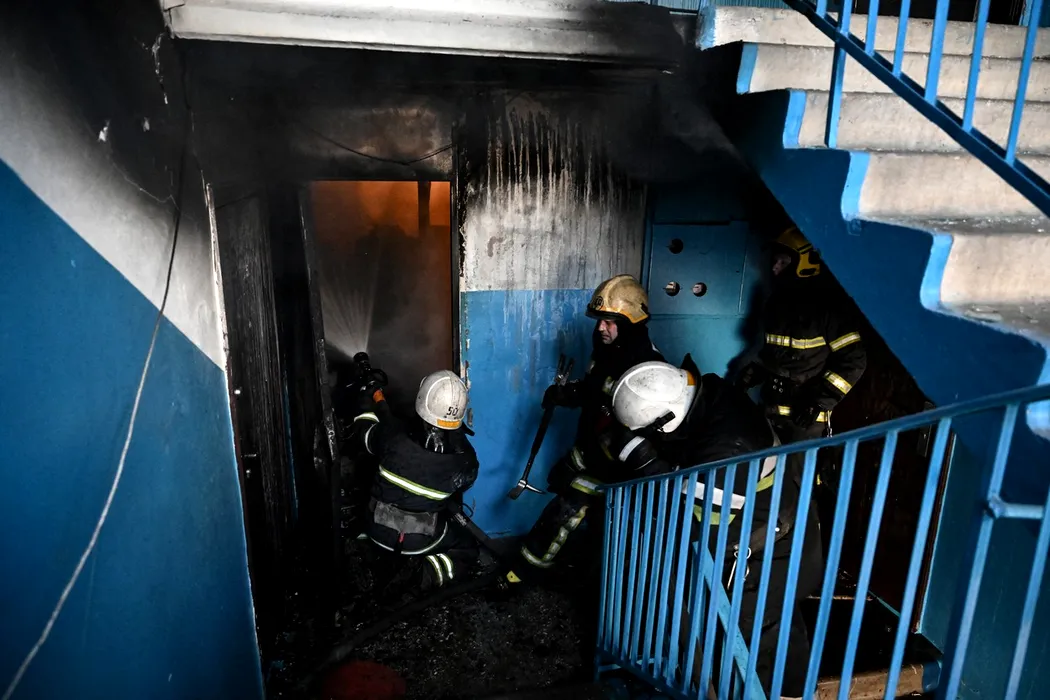 Firefighters work on a fire in a building after bombings on the eastern Ukraine town of Chuguiv on February 24, 2022, as Russian armed forces are trying to invade Ukraine from several directions, using rocket systems and helicopters to attack Ukrainian position in the south, the border guard service said. Russia's ground forces on Thursday crossed into Ukraine from several directions, Ukraine's border guard service said, hours after President Vladimir Putin announced the launch of a major offensive. Russian tanks and other heavy equipment crossed the frontier in several northern regions, as well as from the Kremlin-annexed peninsula of Crimea in the south, the agency said.,Image: 664597974, License: Rights-managed, Restrictions: , Model Release: no, Credit line: Profimedia