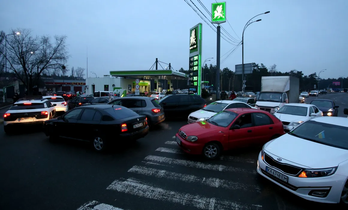 8124811 24.02.2022 Vehicles queue for fuel at a petrol station in Kiev, Ukraine. On February 24 Russian President Vladimir Putin announced a military operation in Ukraine following recognition of independence of breakaway Donbas republics. Stringer / Sputnik