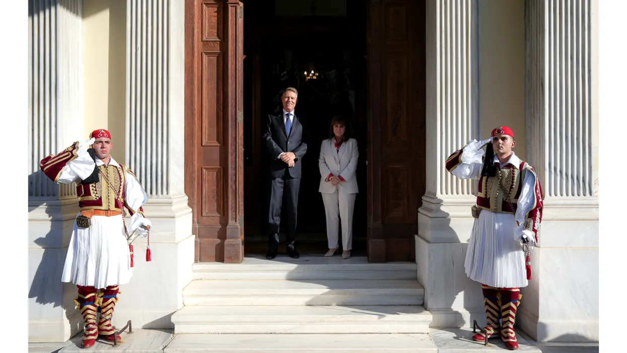 VIDEO | Klaus Iohannis, întâmpinat în Grecia de prim-ministrul Kyriakos Mitsotakis și de câinele său ”Peanut”