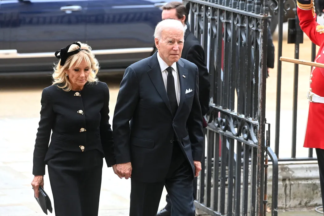 US President Joe Biden and first lady Jill Biden arrive to take their seats inside Westminster Abbey in London on September 19, 2022, for the State Funeral Service for Britain's Queen Elizabeth II. Leaders from around the world will attend the state funeral of Queen Elizabeth II. The country's longest-serving monarch, who died aged 96 after 70 years on the throne, will be honoured with a state funeral on Monday morning at Westminster Abbey.,Image: 724094782, License: Rights-managed, Restrictions: , Model Release: no