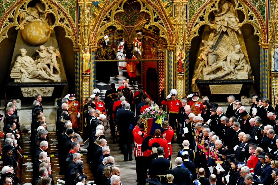 The coffin of Queen Elizabeth II in Westminster Abbey.