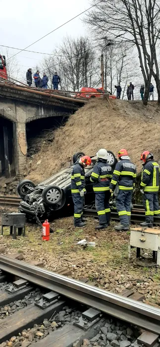 VIDEO | O mașină a căzut de pe un pod, la Predeal. Autoturismul a ajuns pe calea ferată