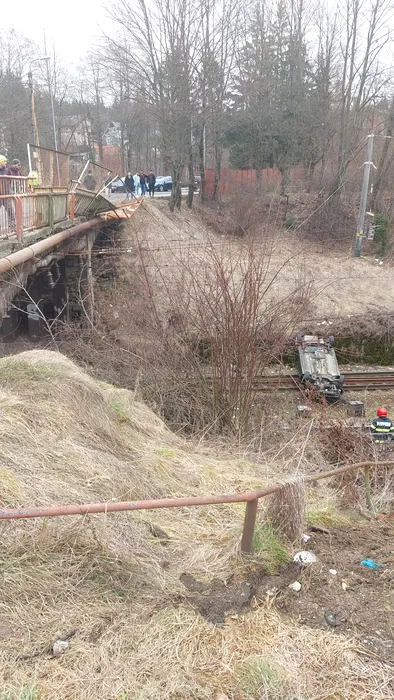 VIDEO | O mașină a căzut de pe un pod, la Predeal. Autoturismul a ajuns pe calea ferată