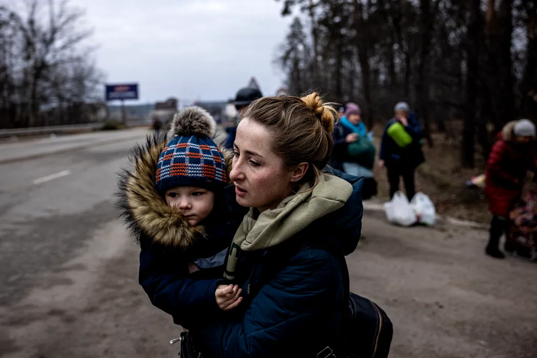 A woman carries her child as they flee the city of Irpin, northwest of Kyiv, on March 7, 2022. Ukraine dismissed Moscow's offer to set up humanitarian corridors from several bombarded cities on Monday after it emerged some routes would lead refugees into Russia or Belarus. The Russian proposal of safe passage from Kharkiv, Kyiv, Mariupol and Sumy had come after terrified Ukrainian civilians came under fire in previous ceasefire attempts.,Image: 666792803, License: Rights-managed, Restrictions: , Model Release: no, Credit line: Profimedia
