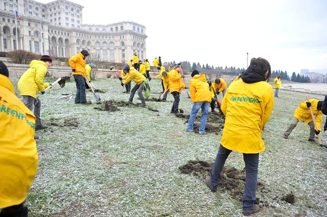 VIDEO. Protest Greenpeace față de legea minelor, la Palatul Parlamentului. Activiștii au fost ridicați de Poliție.