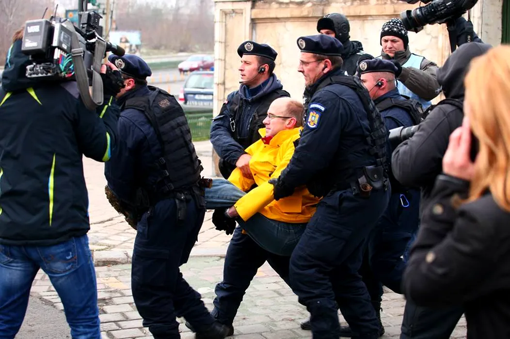 VIDEO. Protest Greenpeace față de legea minelor, la Palatul Parlamentului. Activiștii au fost ridicați de Poliție.