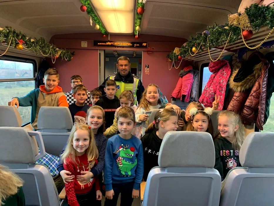 VIDEO | Sute de copii din Mureș s-au plimbat cu „Trenul lui Moș Crăciun” și au învățat cum să se ferească de „rele” și să fie în siguranță