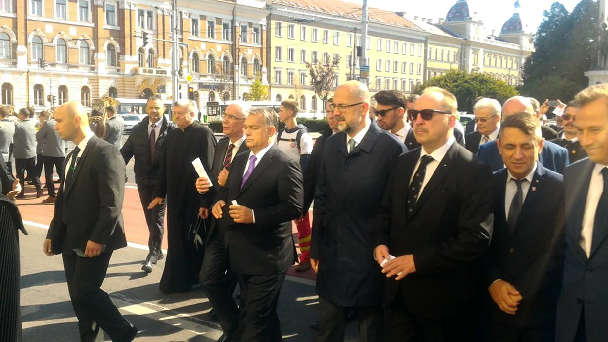 Viktor Orban, alături de Kelemen Hunor într-o procesiune prin centrul Clujului. Peste 1.000 de oameni li s-au alăturat. FOTO