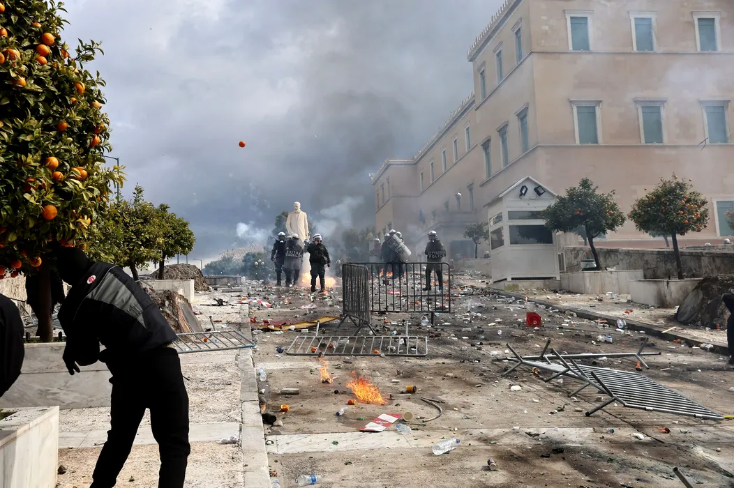 VIOLENȚE la Atena. Sute de mii de oameni au ieșit în stradă pentru a protesta, la doi ani de la cel mai grav accident feroviar din istoria țării