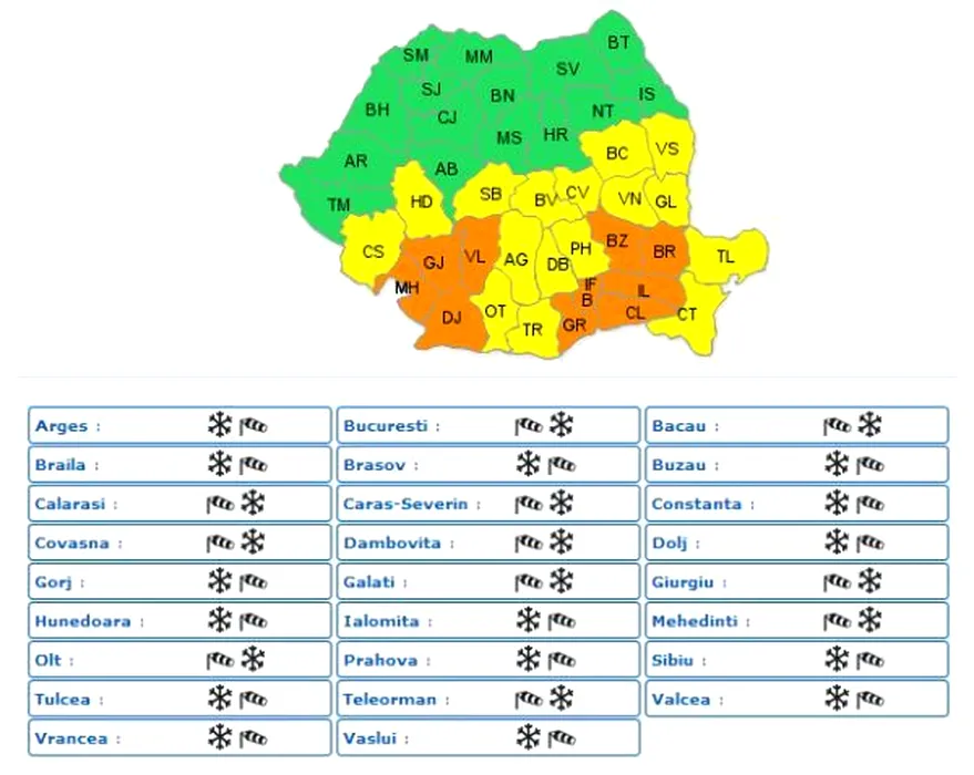 VREMEA. Cod portocaliu de ninsori și viscol în București și 10 județe, cod galben în 16 județe. HARTA zonelor afectate