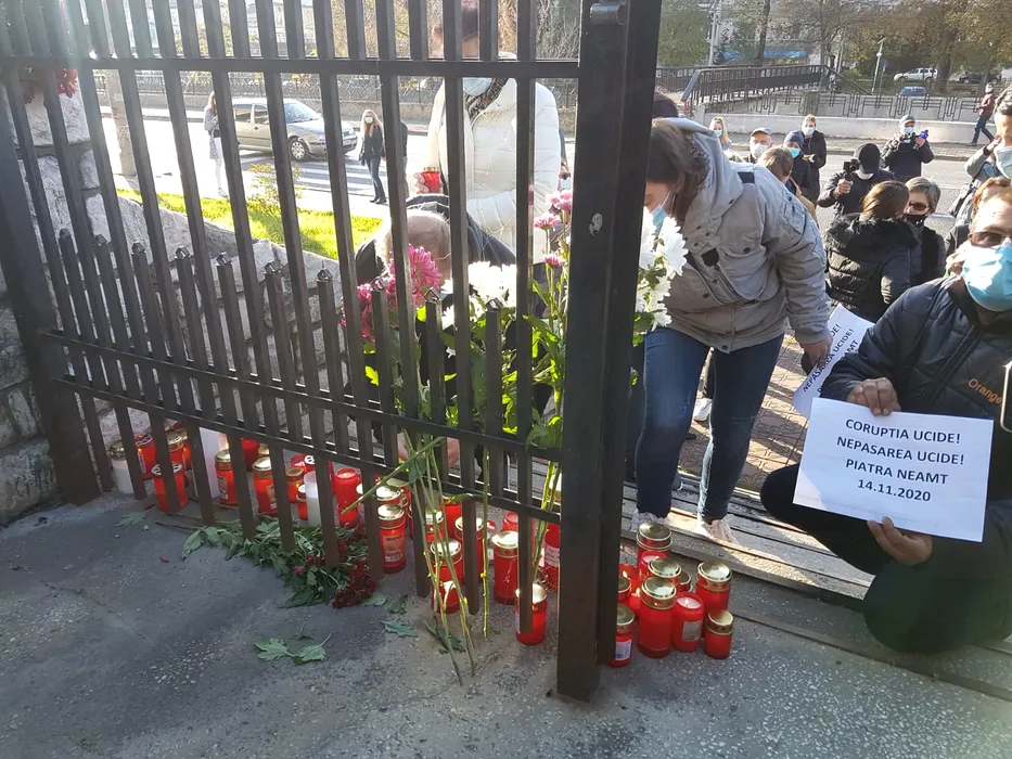 EMOȚIONANT. Zeci de oameni au mers la Spitalul din Piatra Neamț pentru a depune flori și a aprinde lumânări în memoria pacienților decedați sâmbătă (FOTOGRAFII EXCLUSIVE)