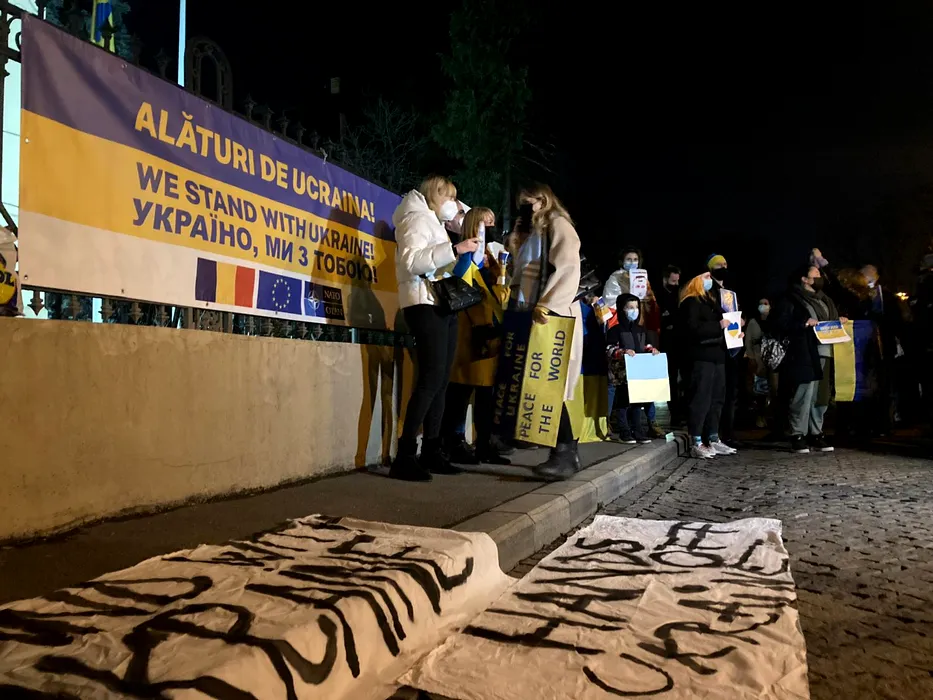Zeci de persoane participă la o manifestaţie în semn de solidaritate cu poporul ucrainean, la Ambasada Ucrainei din Bucureşti (VIDEO)