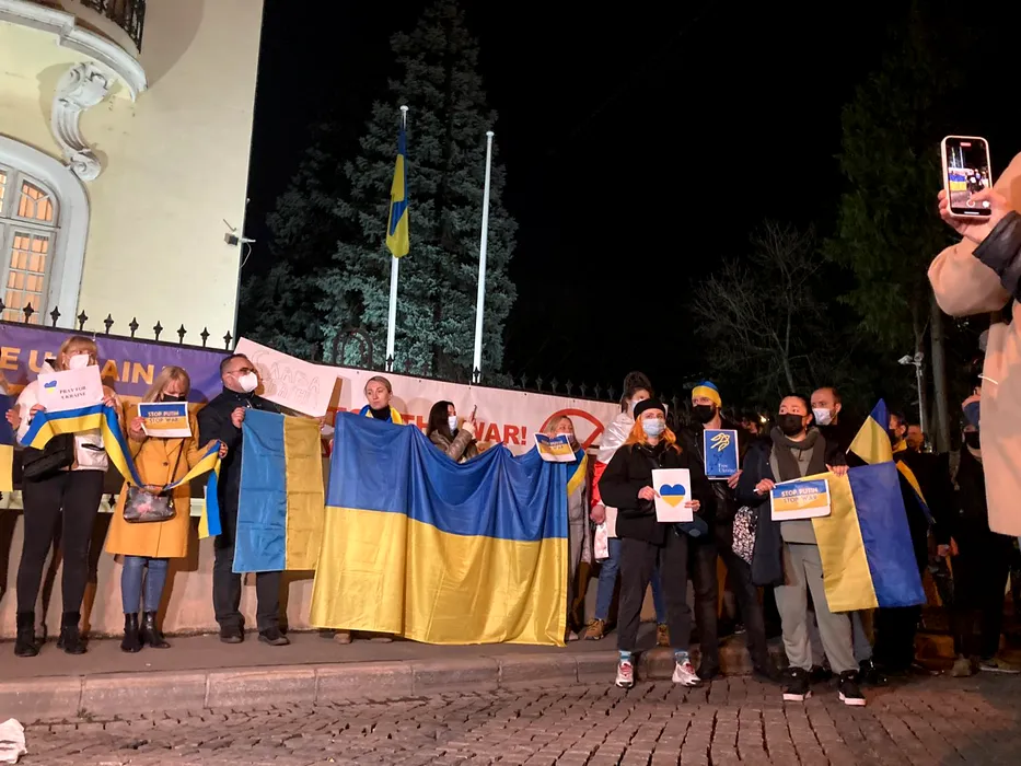 Zeci de persoane participă la o manifestaţie în semn de solidaritate cu poporul ucrainean, la Ambasada Ucrainei din Bucureşti (VIDEO)