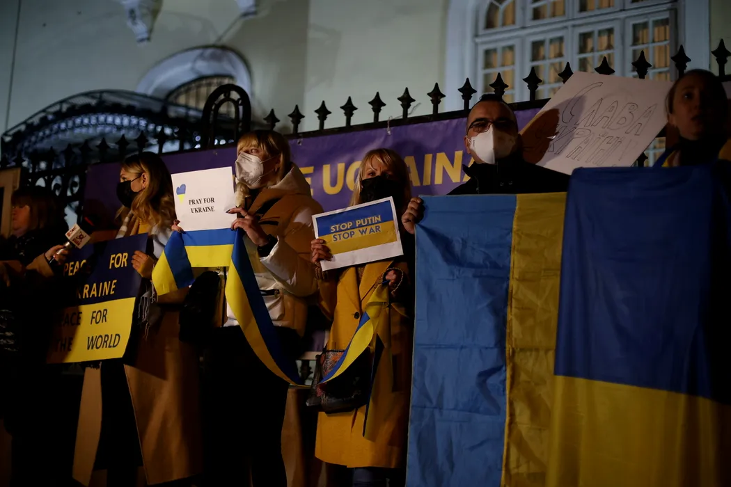 Zeci de persoane participă la o manifestaţie în semn de solidaritate cu poporul ucrainean, la Ambasada Ucrainei din Bucureşti (VIDEO)