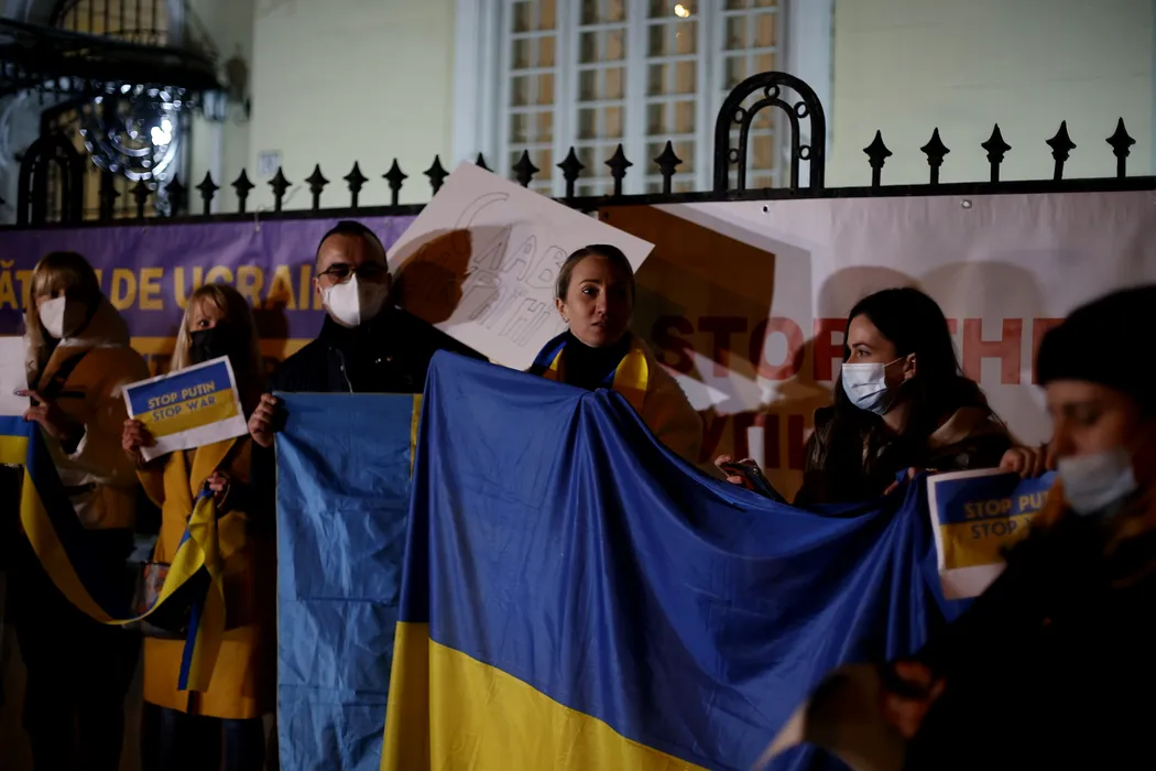 Zeci de persoane participă la o manifestaţie în semn de solidaritate cu poporul ucrainean, la Ambasada Ucrainei din Bucureşti (VIDEO)
