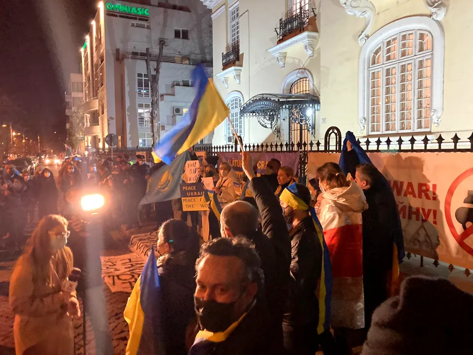 Zeci de persoane participă la o manifestaţie în semn de solidaritate cu poporul ucrainean, la Ambasada Ucrainei din Bucureşti (VIDEO)