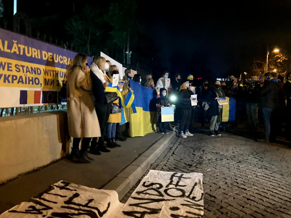 Zeci de persoane participă la o manifestaţie în semn de solidaritate cu poporul ucrainean, la Ambasada Ucrainei din Bucureşti (VIDEO)