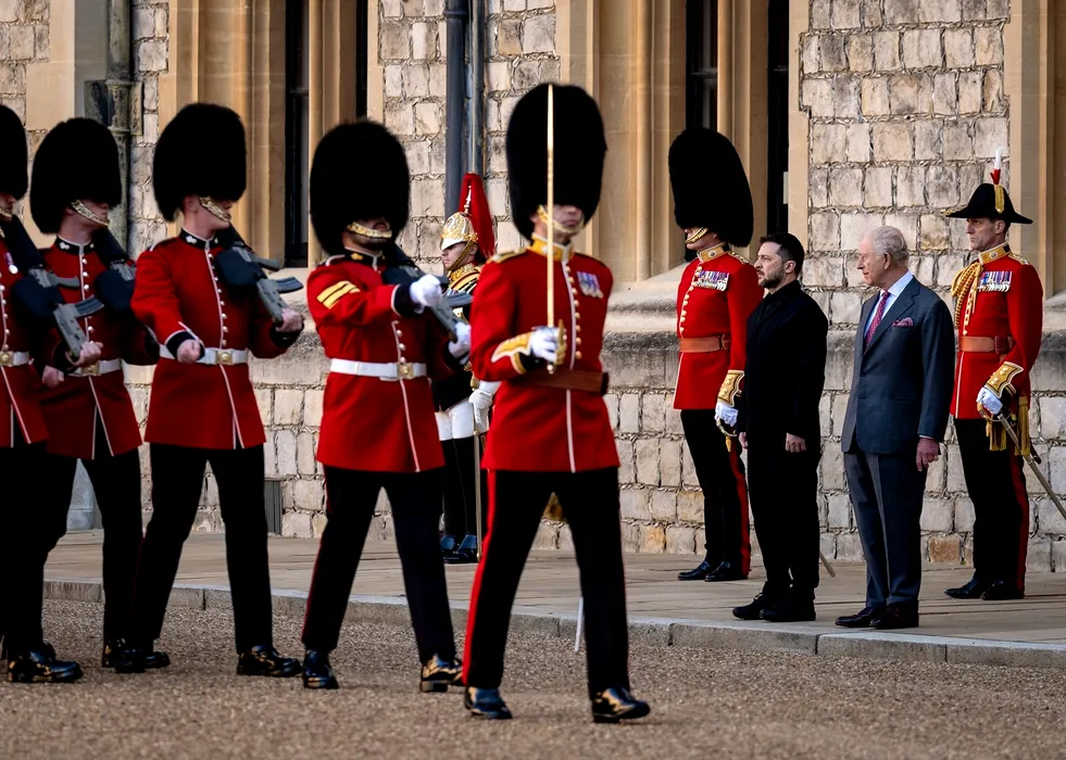 Zelenski este întâmpinat în Marea Britanie de către regele Charles al III-lea și Garda de Onoare, printr-o ceremonie regală cu fast