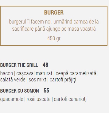 Burgerii, una dintre mâncărurile frecvent alese de români când iau masa în oraș, sunt de două tipuri la restaurantul din nordul Capitalei: Burger The Grill și Burger cu somon, iar prețurile acestora variază între 48 și 55 de lei, conform meniului localului deținut de Dani Oțil.