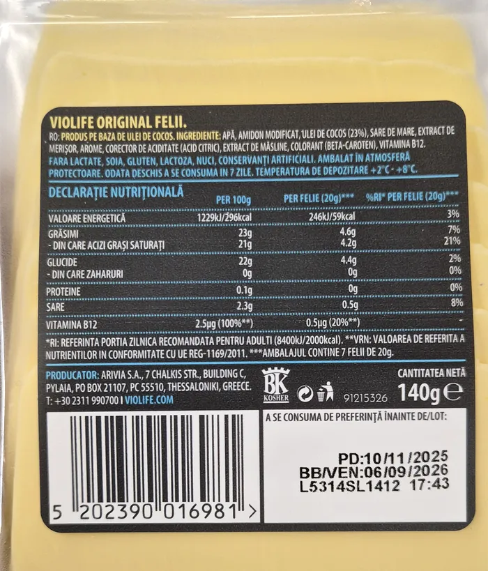 Cașcavalul feliat de la Mega Image, pe bază de ulei de cocos, conține apă, amidon modificat, ulei de cocos (23%), sare de mare, extract de merișor, arome, corector de aciditate (acid citric), extract de măsline, colorant (beta-caroten), vitamina B12.