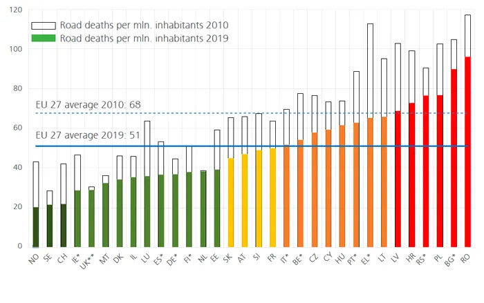 Comparativ cu celelalte țări din UE, România a avut cel mai slab progres în ceea ce privește îmbunățirea siguranței circulației rutiere în ultima decadă, după cum este prezentat și în cel mai recent raport al Consiliului European de Siguranță în Transporturi[1].
