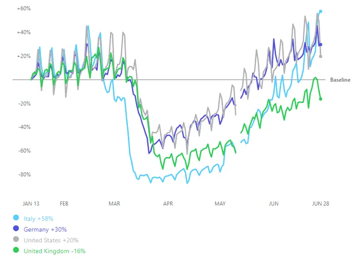 Figura 1. Schimbări în mobilitate in Italia, Germania, Statele Unite ale Americii și Marea Britanie, perioada 13 ianuarie – 28 iunie 2020[8]