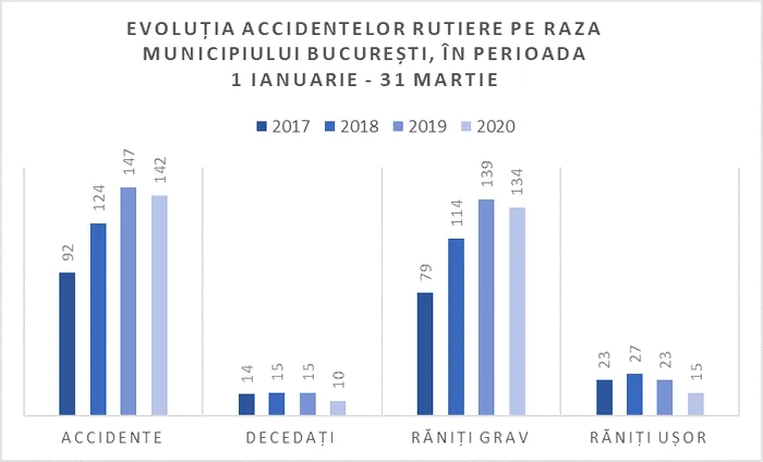 Conform datelor puse la dispoziție de Inspectoratul General al Poliției Române- Direcția Rutieră, pe raza municipiului București a fost înregistrată o scădere a numărului de accidente, cât și a numărului persoanelor decedate, rănite grav și rănite ușor, pentru perioada 1 ianuarie – 31 martie, pentru anii 2017, 2018, 2019 și 2020. Însă, această scădere nu este nici pe departe pe măsura așteptărilor, după cum se poate observa în figura 2.