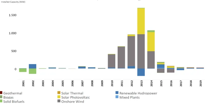 Tranziția energetică mondială evoluează într-un ritm diferit de la o țară la altă. La prima vedere, România și-a atins în 2018 ținta de 24% cu privire la ponderea energiei din resurse regenerabile în consumul final brut de fixat pentru anul 2020 (Eurostat, 2020). Însă acest lucru ilustrează lipsa de ambiție din ultimii ani. România este înzestrată cu resurse naturale bogate, are o capacitate importantă de producție a energiei hidroelectrice, deține o rețea electrică de transport interconectată cu țările vecine și are acces la o piață unică de energie electrică europeană cu tranzacționării transfrontaliere intrazilnice, avantaje ce ar putea crește semnificativ ponderea energiei regenerabile. Însă în afară de perioada 2010-2015 care înregistrat o creștere a capacității de producție regenerabilă pe fondul construcției de centrale eoliene și solare fotovoltaice ce au beneficiat de sprijin prin certificate verzi, după cum reiese din Figura 1, ultimii cinci ani sunt caracterizați de o stagnare acută din lipsa investiților și a schemelor de sprijin.