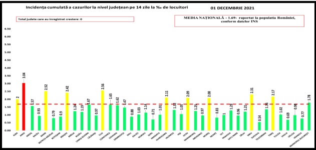 Incidența cumulată a cazurilor la nivel național din ultimele 14 zile a ajuns miercuri, 1 decembrie, la o medie de 1,68 la mia de locuitori, în scădere de la 1,77, cât a fost marți, 30 noiembrie.