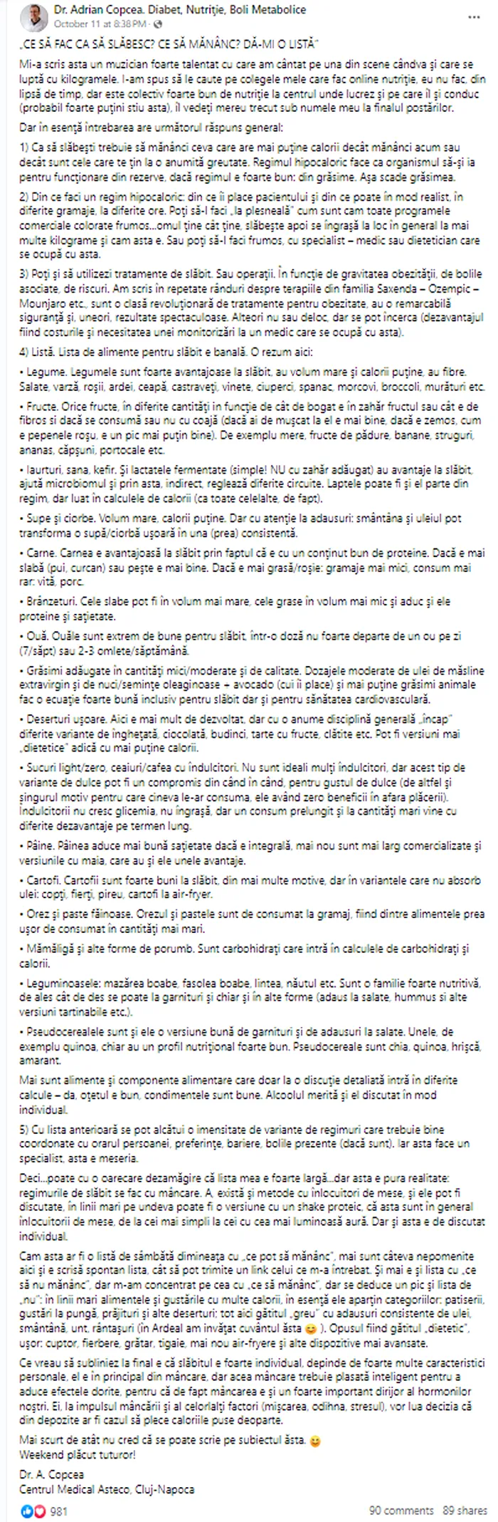„I-am spus să le caute pe colegele mele care fac online nutriţie, eu nu fac, din lipsă de timp, dar este colectiv foarte bun de nutriţie la centrul unde lucrez şi pe care îl şi conduc (probabil foarte puţini stiu asta), îl vedeţi mereu trecut sub numele meu la finalul postărilor”, a scris Dr. Adrian Copcea.