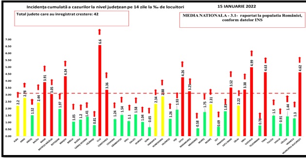 Incidența infectărilor cumulate la 14 zile, raportate la 1.000 de locuitori – calculat de către Direcțiile de Sănătate Publică, la nivelul Municipiului București și al județelor – a ajuns, sâmbătă, la 3,1 la mia de locuitori.