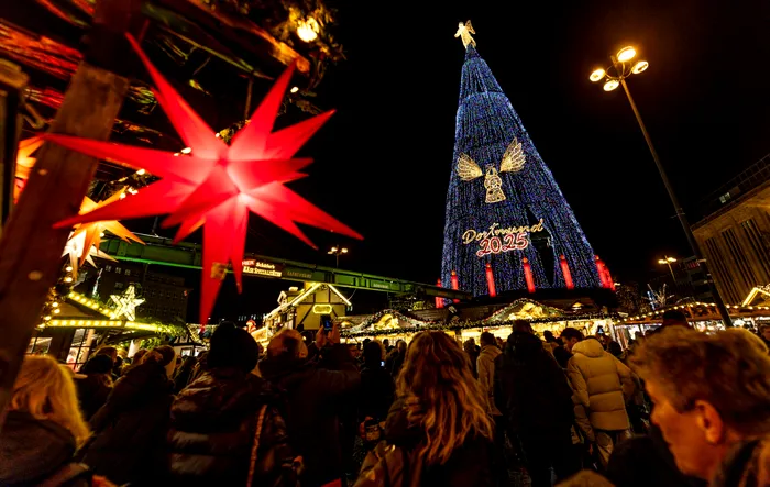 24 November 2025, North Rhine-Westphalia, Dortmund: The giant Christmas tree at the Dortmund Christmas market is lit up with 140,000 thousand LEDs. According to the organizers, the world’s largest Christmas tree, which is made up of hundreds of spruce trees and thus reaches a height of 45 meters, will be illuminated with more lights than ever this year. Photo: Dieter Menne/dpa