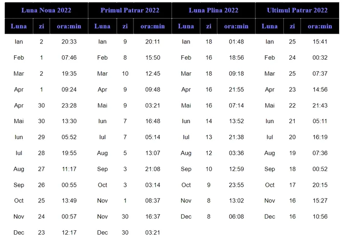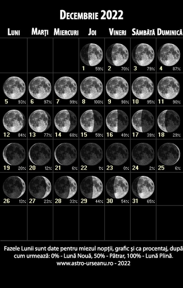 • Decembrie 2022: Luna plină – 8 decembrie / Luna nouă – 23 decembrie