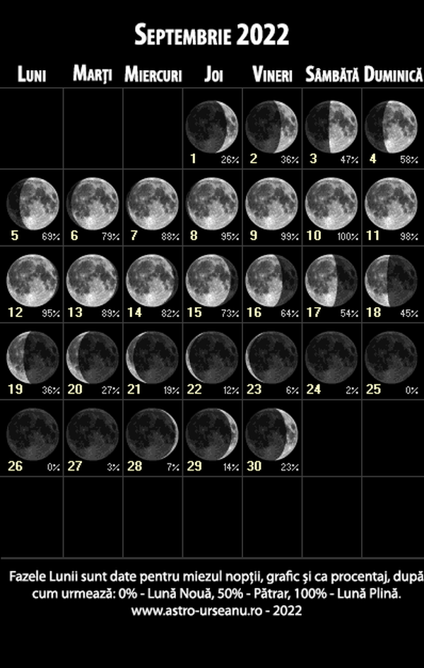 • Septembrie 2022: Luna plină – 10 septembrie / Luna nouă – 26 septembrie